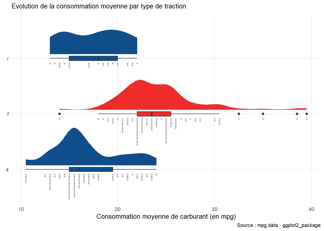 - Comment le type de traction inflence -t-il la consommation moyenne ? (avg_mpg vs. drv)
