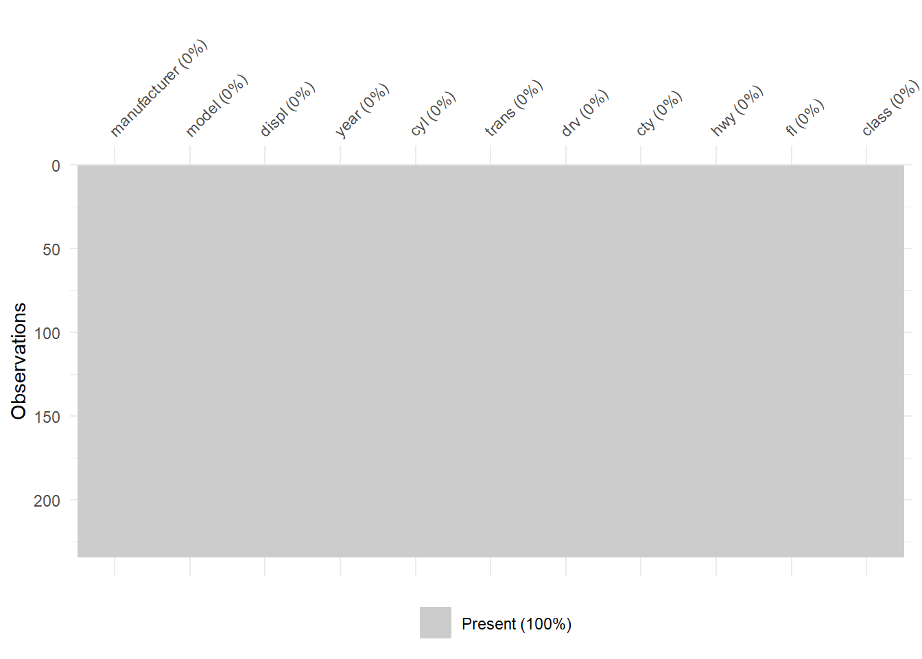 Le graphique totalement gris montre que les données mpg ne contiennent pas de valeurs manquantes